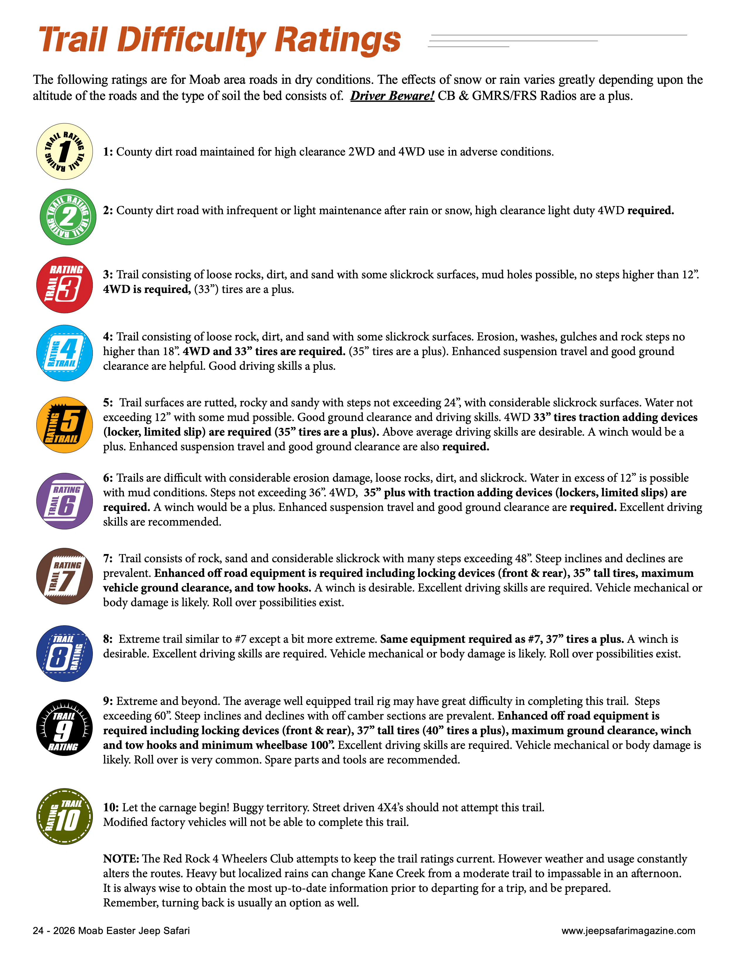 Moab doesn’t rate trails based on vibes. The 1–10 scale published for the 2026 Easter Jeep Safari is tied directly to terrain type, obstacle height, tire size, traction devices, and rollover risk — and it applies to dry conditions. The guide clearly notes that snow or rain can significantly change difficulty depending on soil and elevation. It also states: Driver Beware! and mentions that CB & GMRS/FRS radios are a plus.